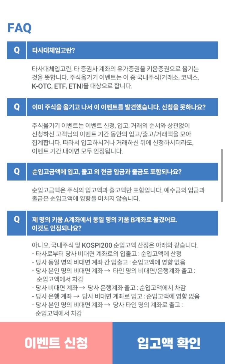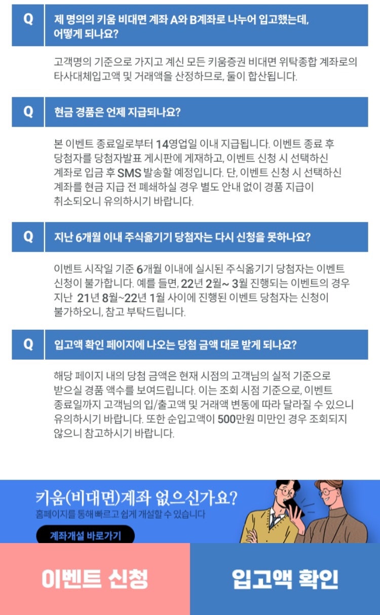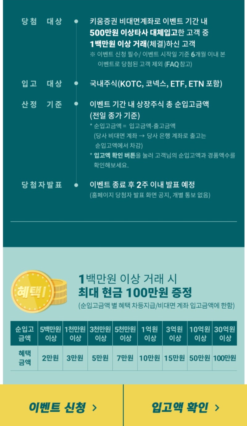 KB 제3자 대체 인바운드 이벤트 예를 들어 제3자 대체보관이 1000만원 초과시 5,000원 ​​/ 자산유지금액이 1000만원 이상 유지시 22.1.31까지 5,000원입니다. 50,000,000원과 쿠폰 이벤트도 함께 진행되니 이벤트 응모 꼭 눌러주세요! 오늘 모두 감사합니다.