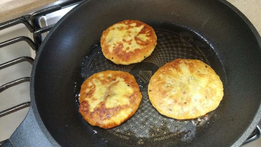 8. 호떡을 뒤집어 반대쪽이 노릇노릇해질 때까지 굽는다.